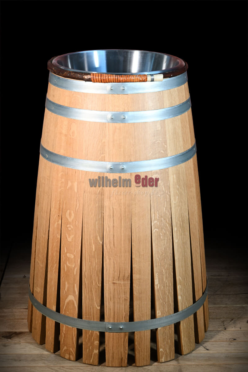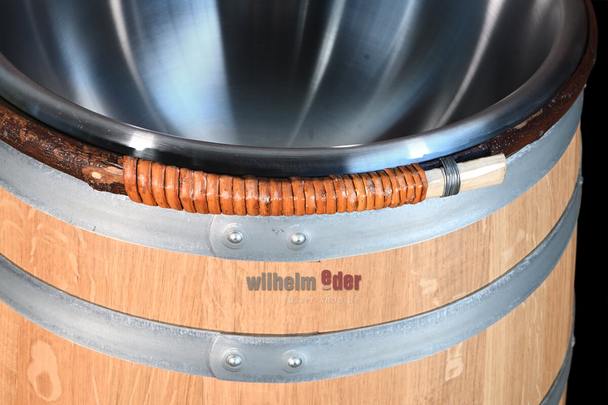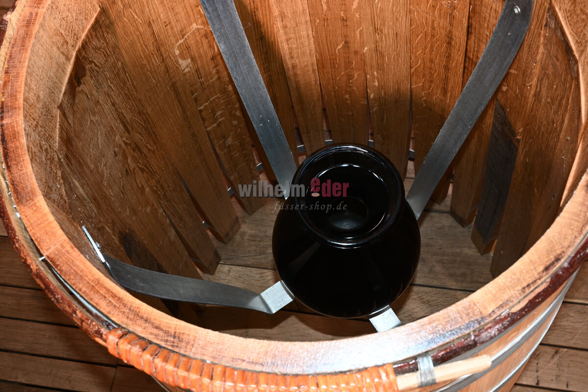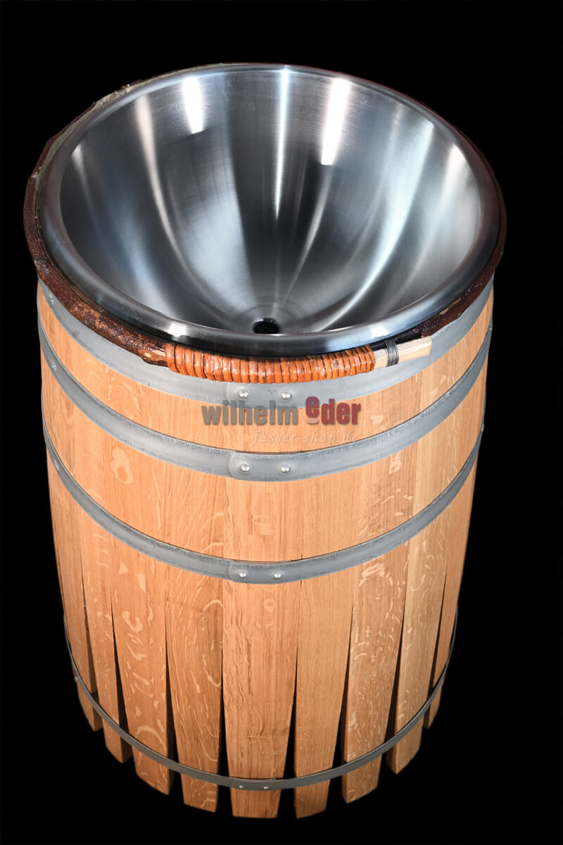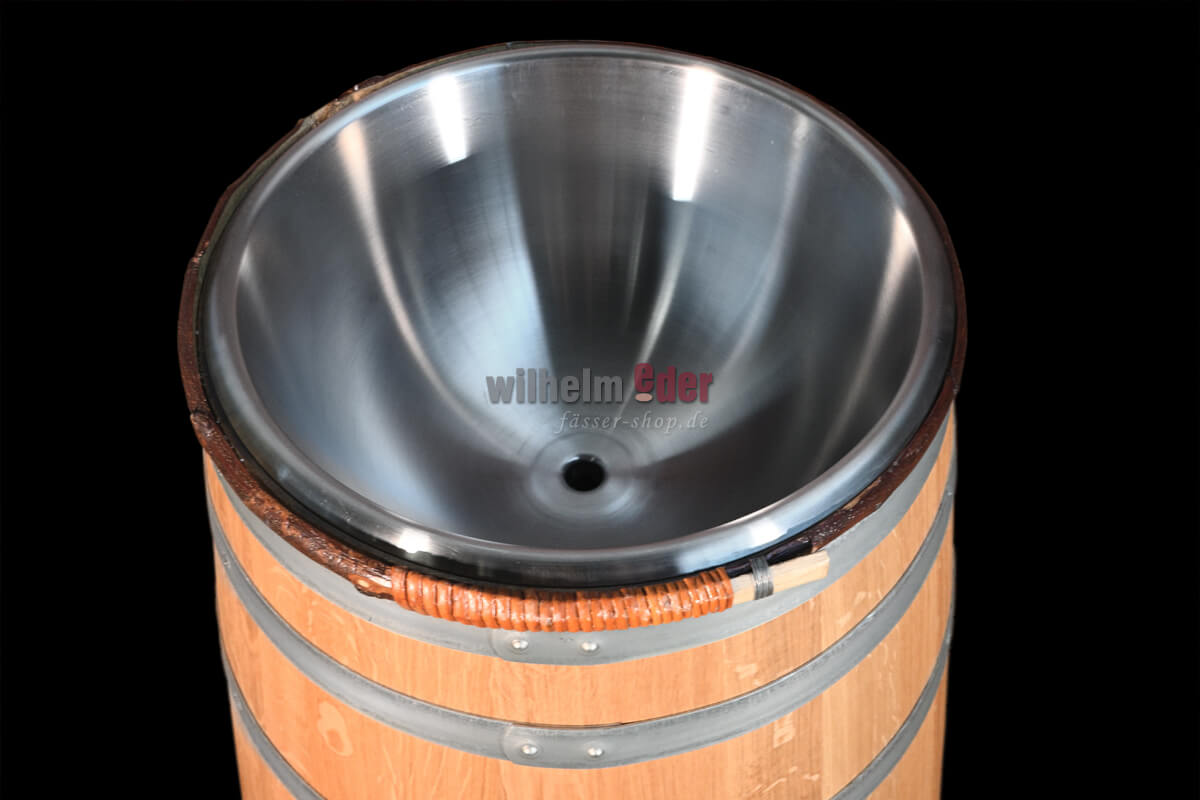 Das Ausgussgefäß wird aus original Fassdauben gefertigt und mit Ringen gehalten. Ein Metalltrichter fängt die ausgegossene Flüssigkeit auf, welche danach in ein nicht sichtbares Gefäß fließt. Der Trichter und das Glasgefäß lassen sich ganz einfach aus dem Fass heraus heben und reinigen.