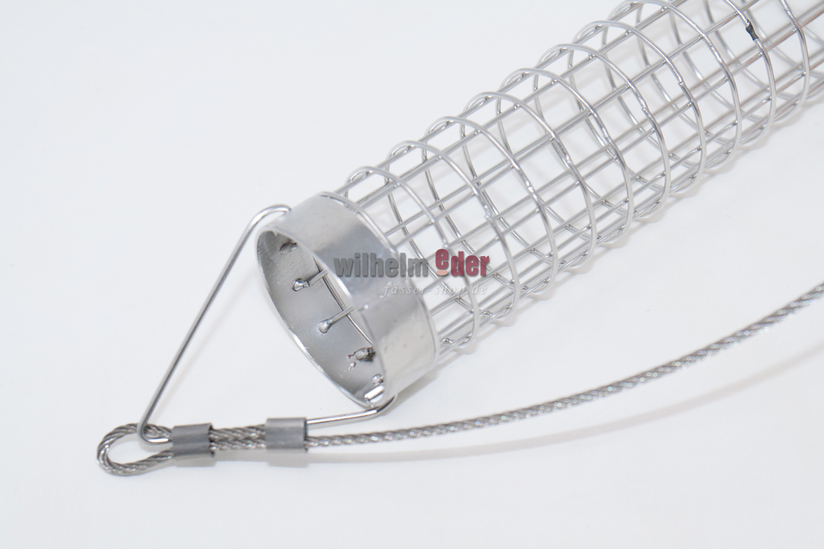 Konischer Holzspund mit Edelstahlöse im Set mit einem am Seil befestigten Edelstahlkorb, welcher das Einhängen mehrerer Schwefelschnitten im Fass ermöglicht.