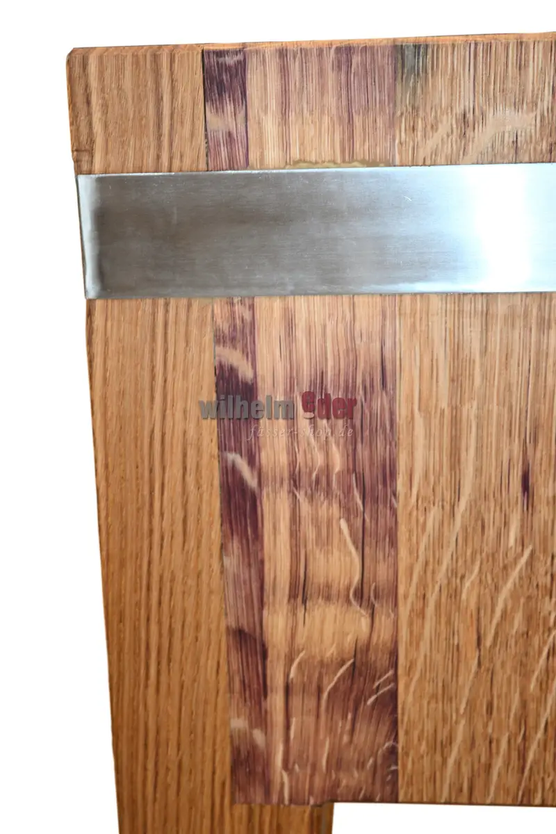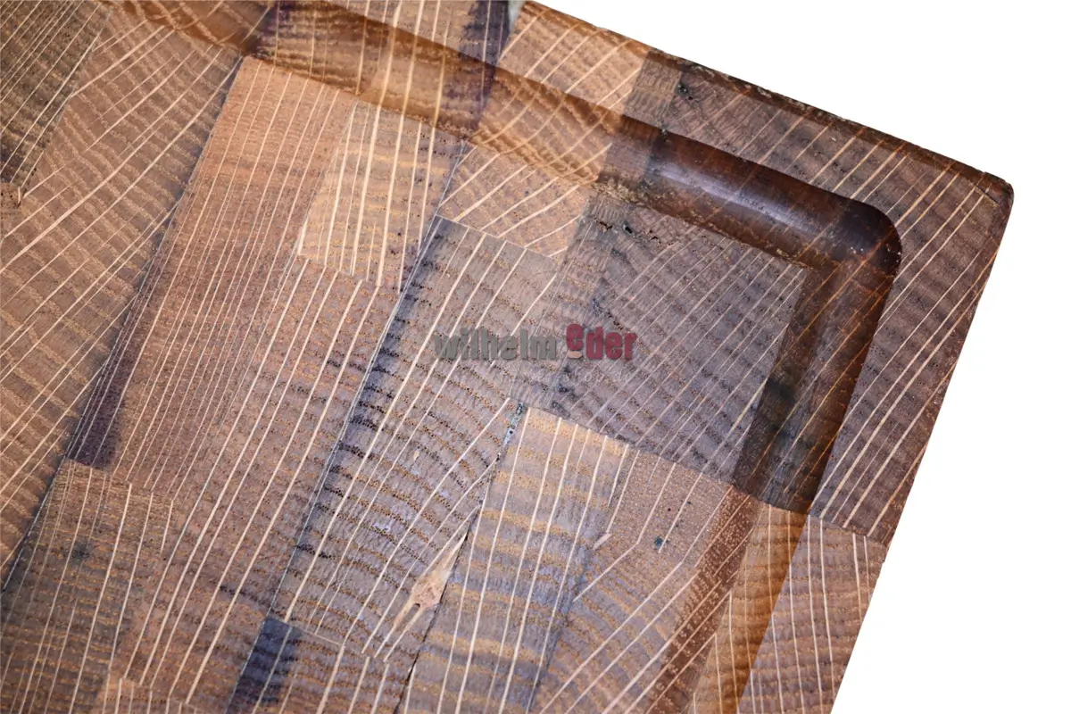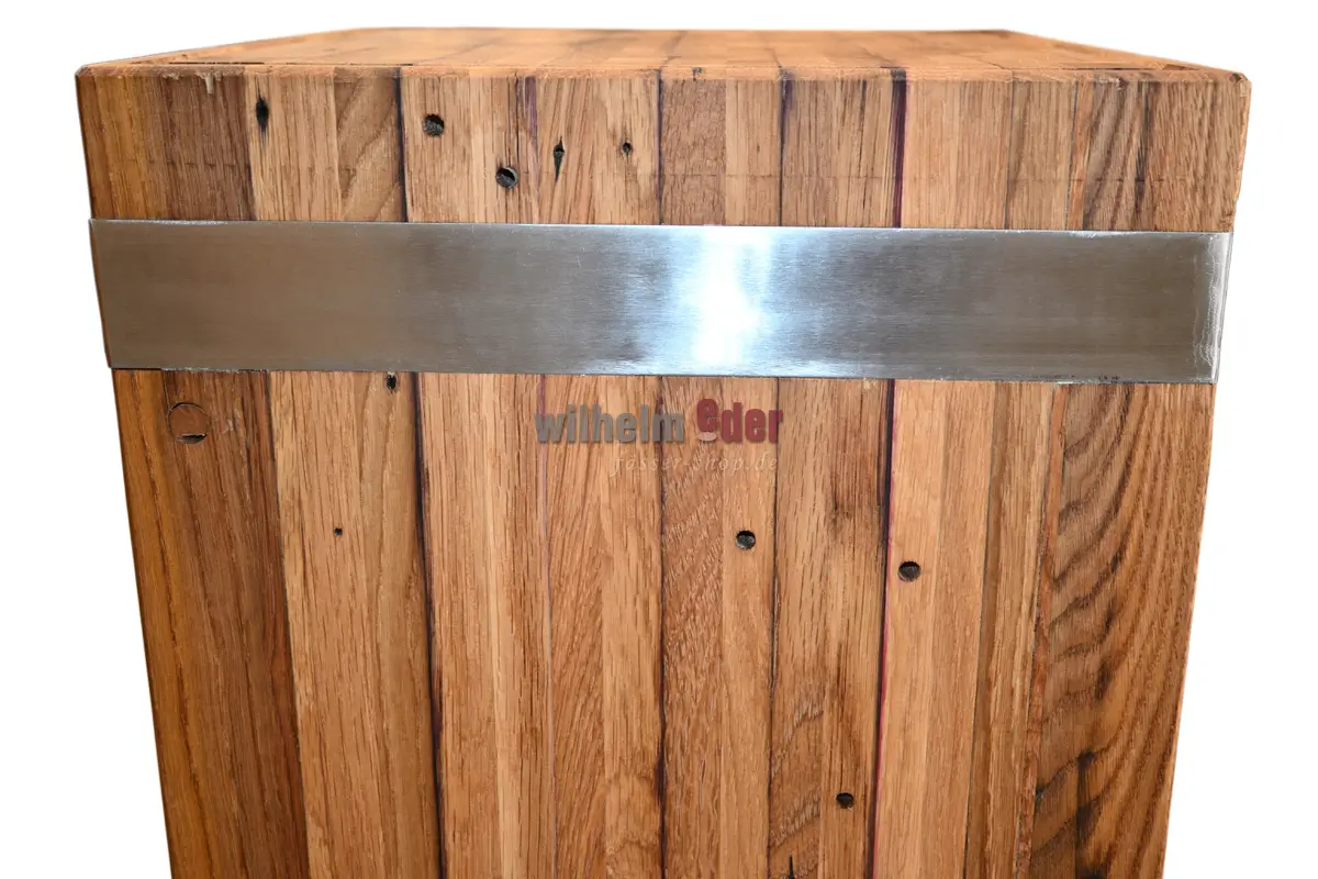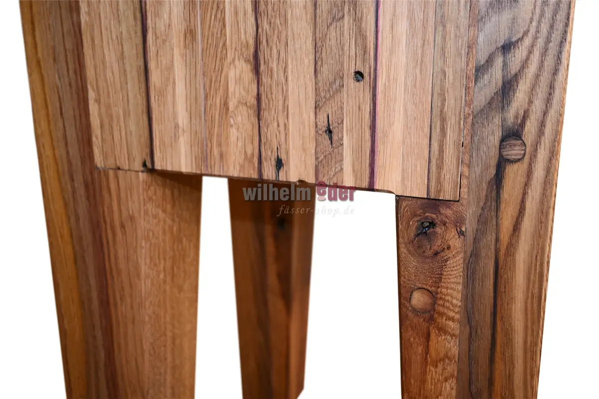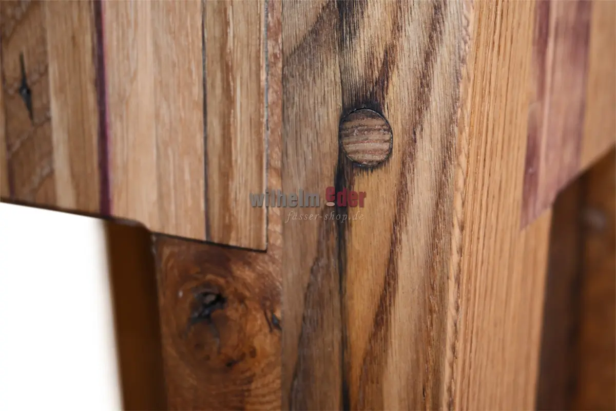 Die Verwendung recycelter Rotweinfass-Köpfe verleiht dem Hackklotz eine rustikale Optik und erzählt die Geschichte vergangener Weinjahre. Auch als Hackbock nutzbar ist er ein Unikat mit authentischem Charakter.