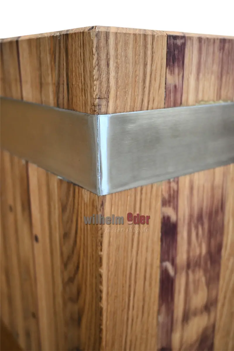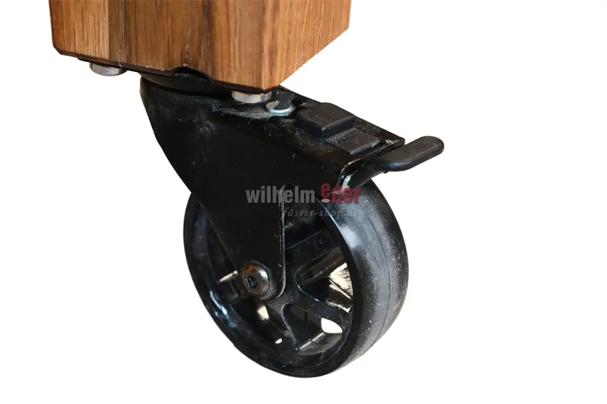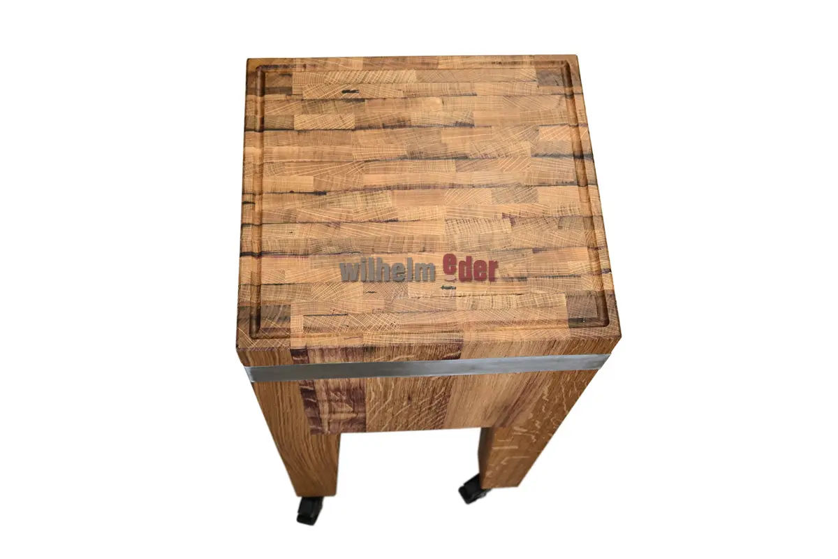 Der mobile, massive Präsentierwagen, gefertigt aus den Köpfen von 25 Rotweinfässern, ist nicht nur ein handwerkliches Kunstwerk, sondern auch eine vielseitige Bereicherung für die Küche. Mit einer Gesamthöhe von ca. 85 cm und 4 Rollen kombiniert er Tradition mit Innovation.