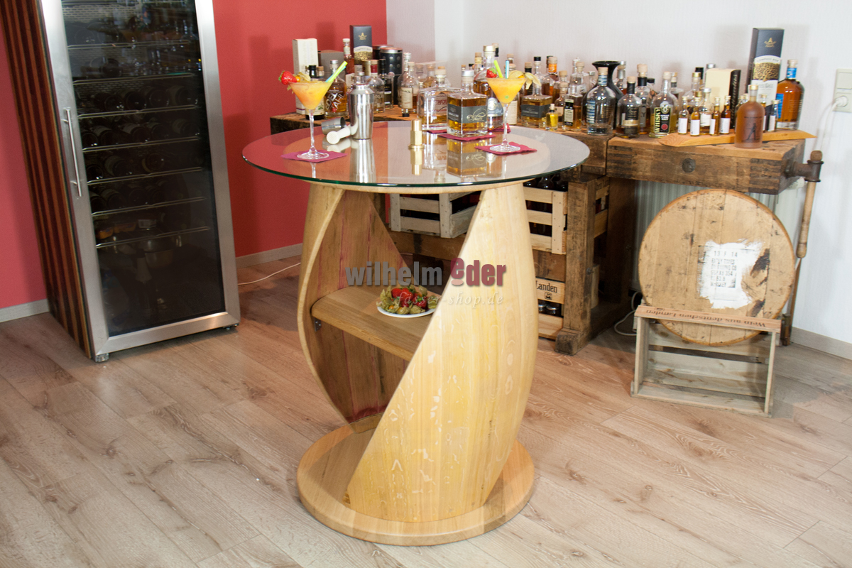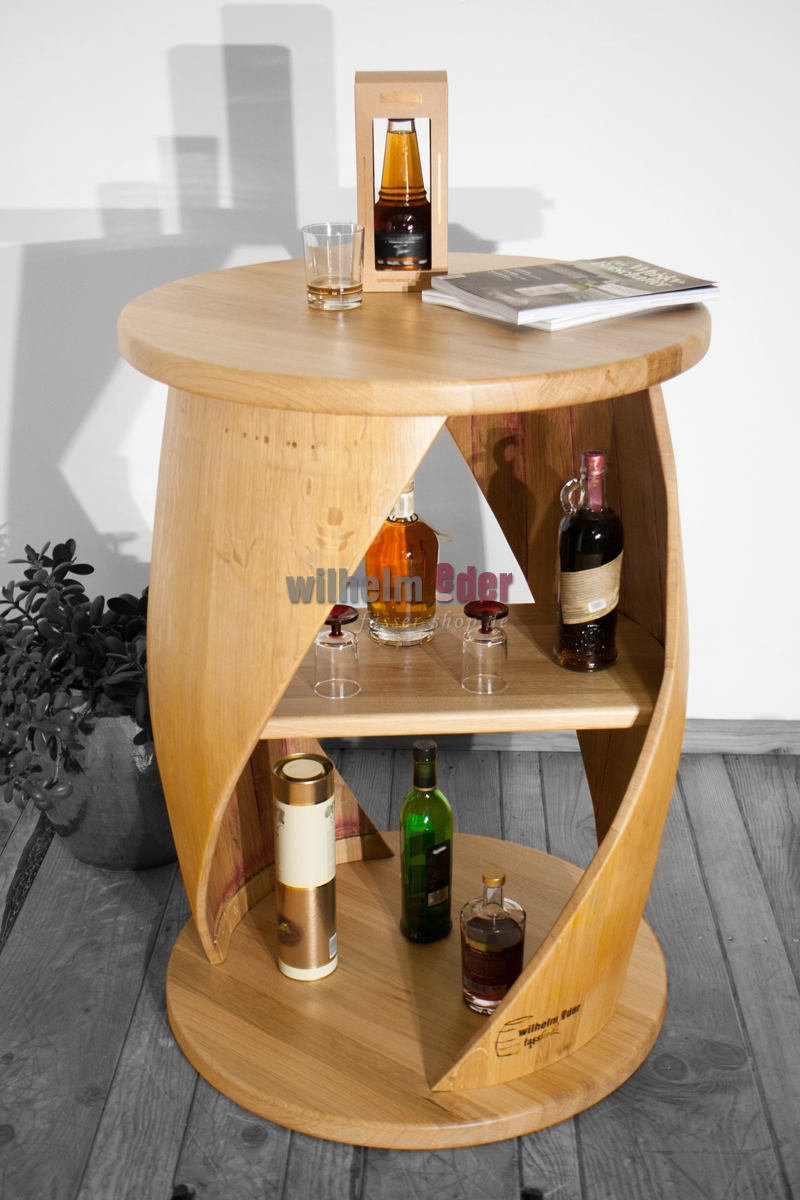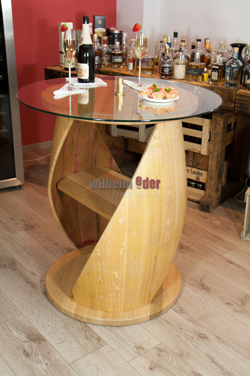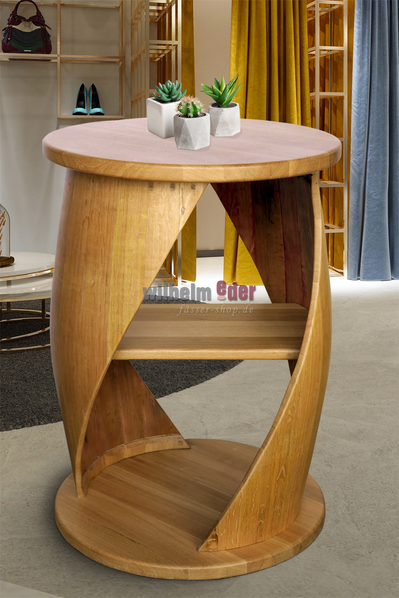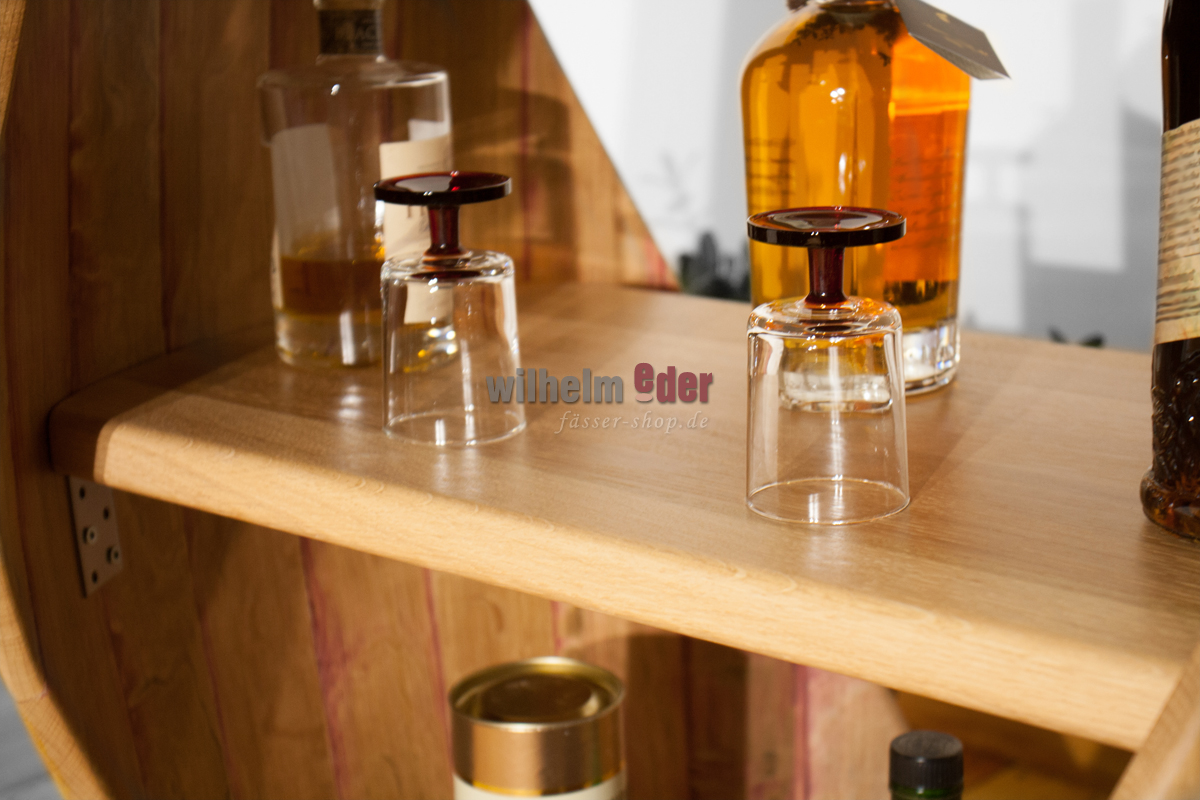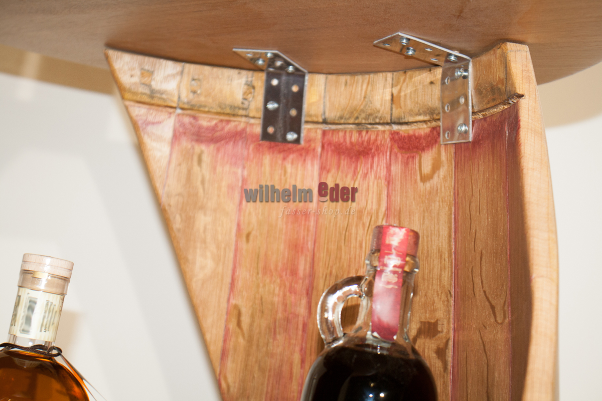 Exklusives Regalfass, hergestellt aus einem gebrauchtem 225 l Weinfass, welches in aufwendiger Handwerksarbeit in dieses tolle Möbelstück verwandelt wurde. Das Fass wurde professionell gereinigt, getrocknet, verleimt und fein verschliffen. Zwei seitliche gesägte Rundungen machen das Fass zum Blickfang Ihres Lieblingszimmers. Der mittig eingelegte Regalboden ist aus Massivholz.