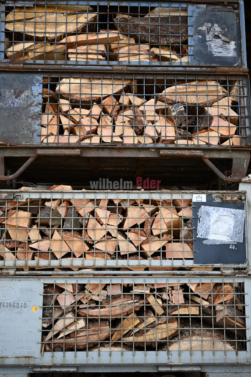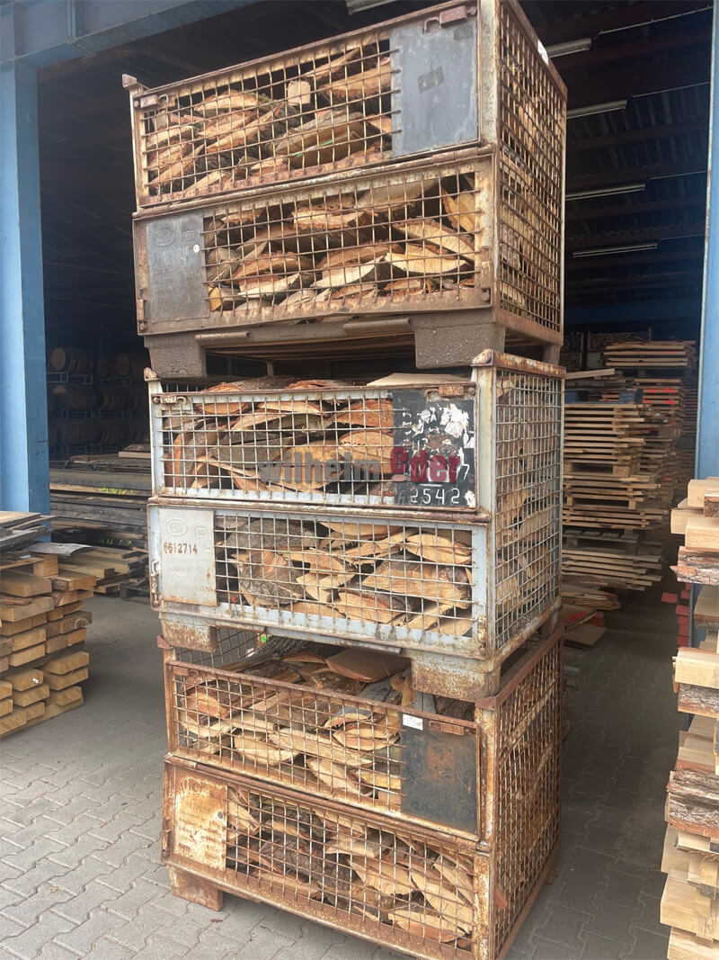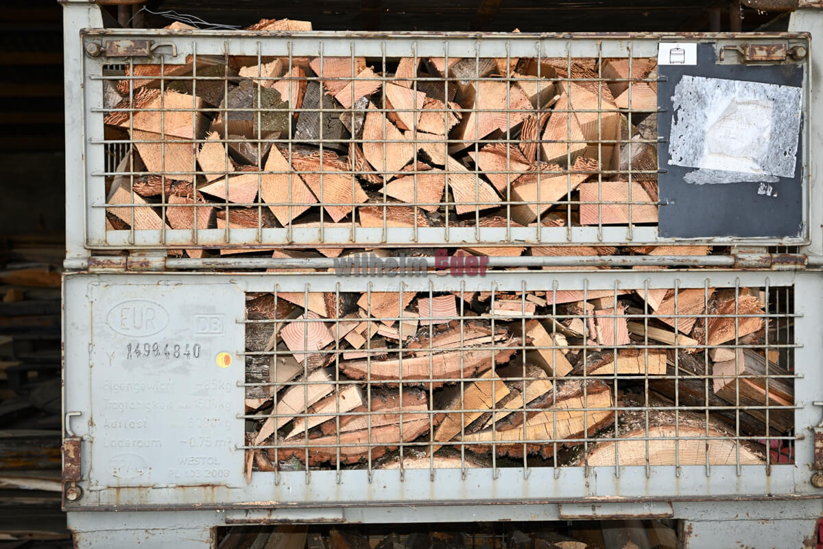 Eine Gitterbox, gefüllt mit Schüttholz aus unseren Sägewerk-Abschnitten aus verschiedenen Holzarten, wie z.B. Eiche, Douglasie, Buche, Esche, Edelkastanie, Robinie und weiteren heimischen Hölzern.