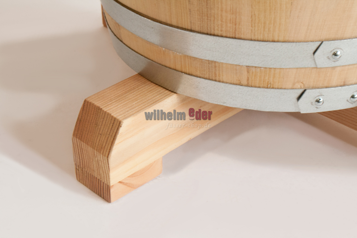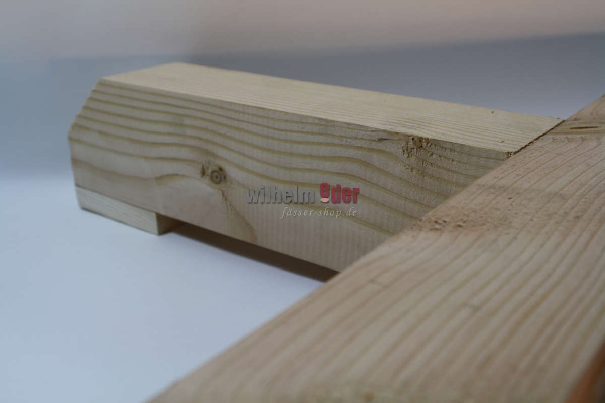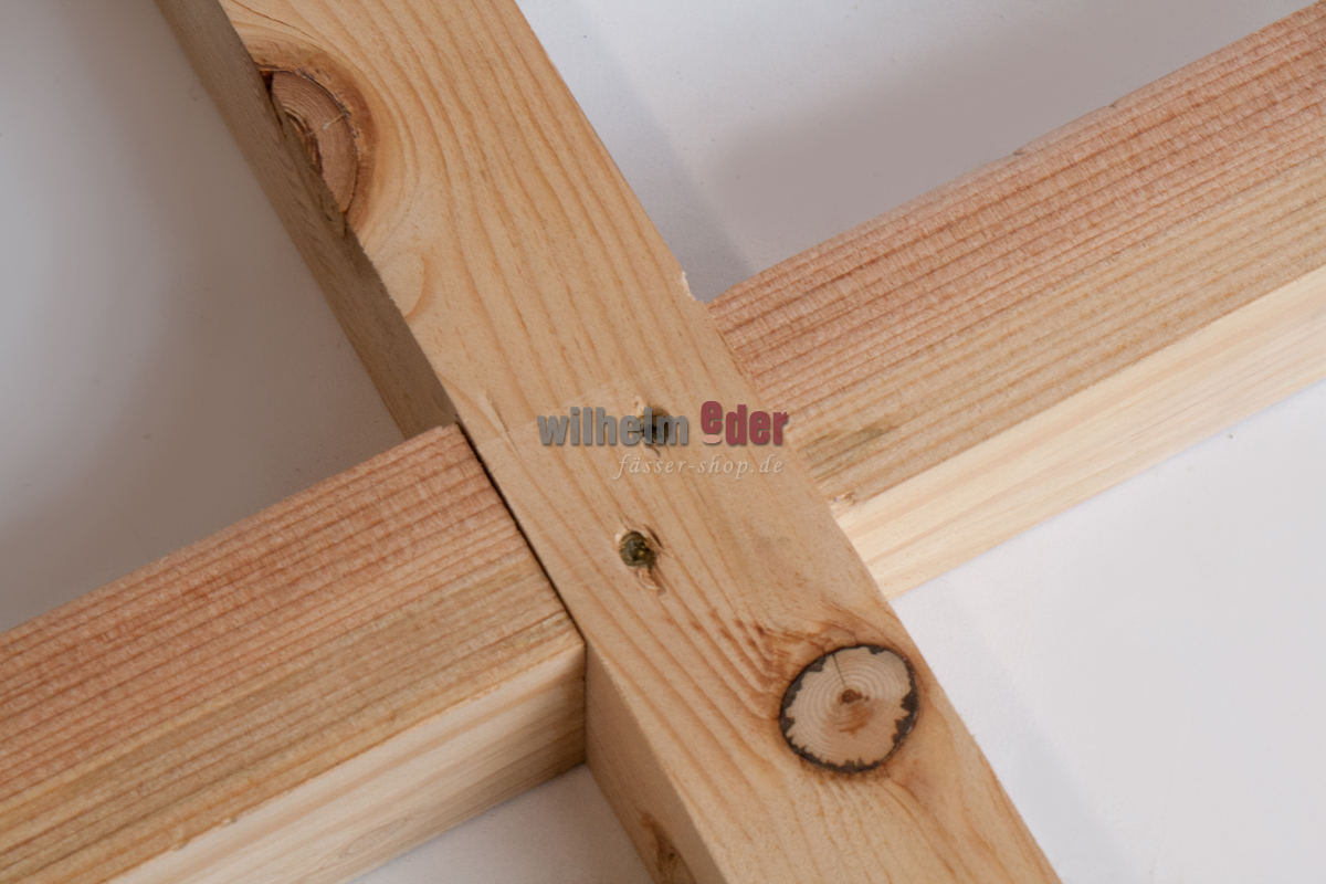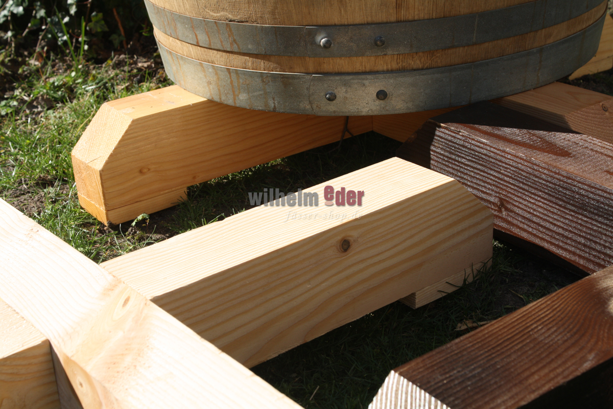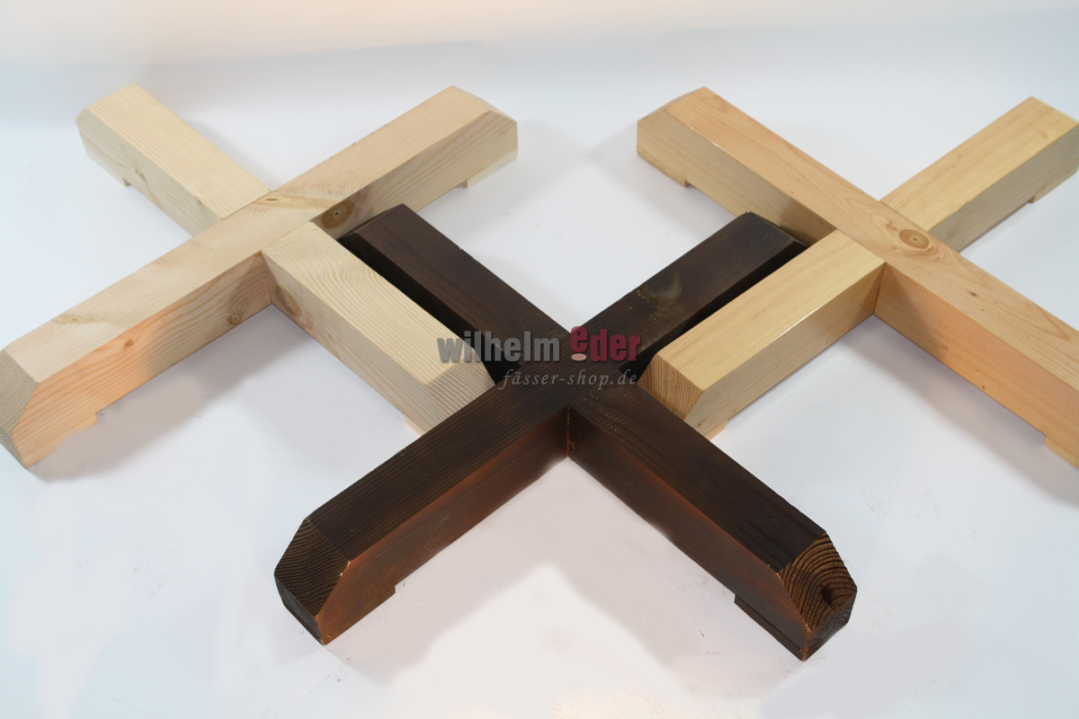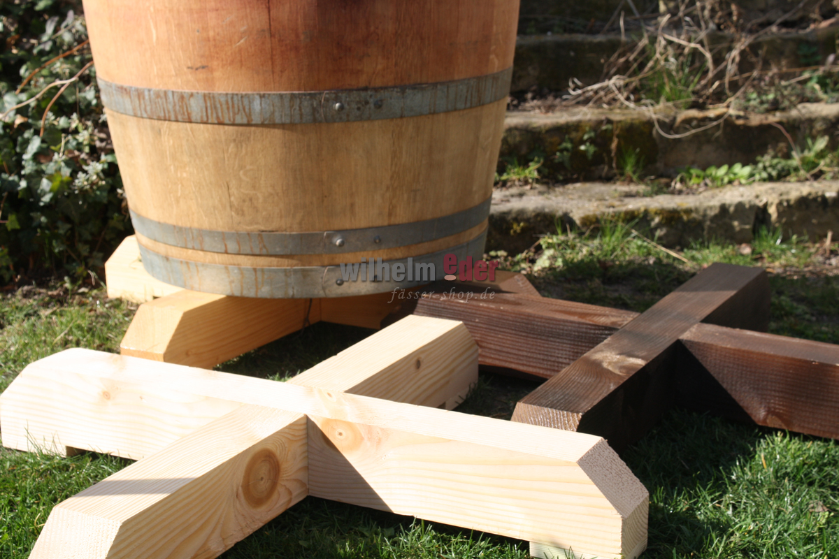 Dank dem Unterstellkreuz stehen die Fässer leicht erhöht und bei den Regenfässern mit Ablaufhahn entsteht der Vorteil, dass der Hahn bequem bedient und ein Gefäß untergestellt werden kann.