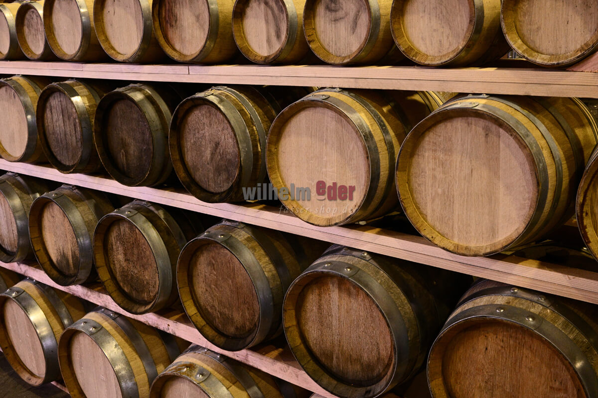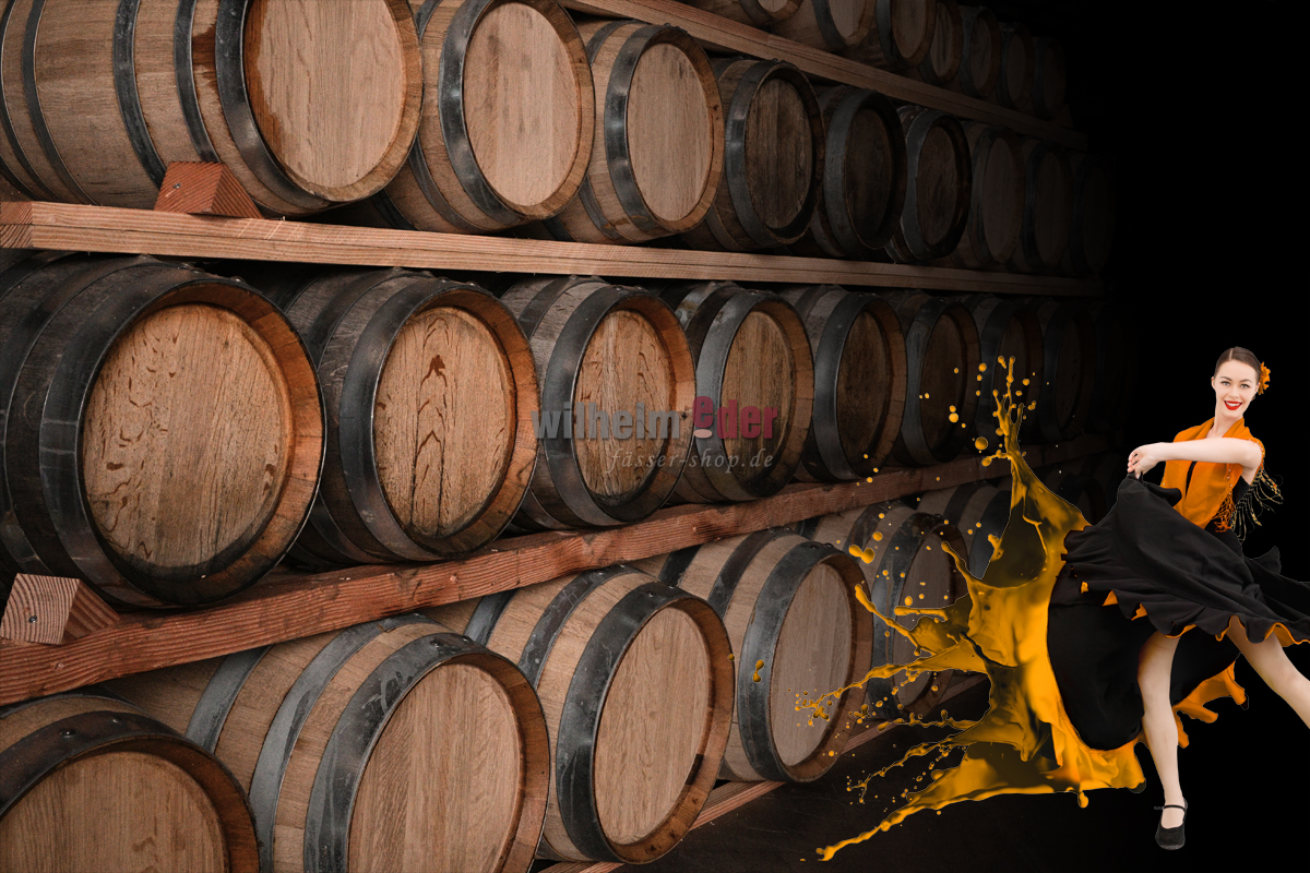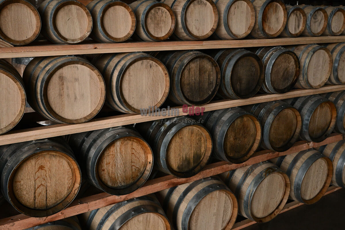 Die kleinen (3 l - 100 l) Sherryfässer aus neuer Europäischer Eiche werden von uns zunächst gedämpft um das vorhandene Tannin zu mildern. Danach werden sie für bis zu 12 Monate mit Sherry der Sorte Cream, den wir lose direkt von ausgewählten Bodegas in Spanien beziehen, belegt. Die Fässer lagern zur Reifung bei uns in Bad Dürkheim.