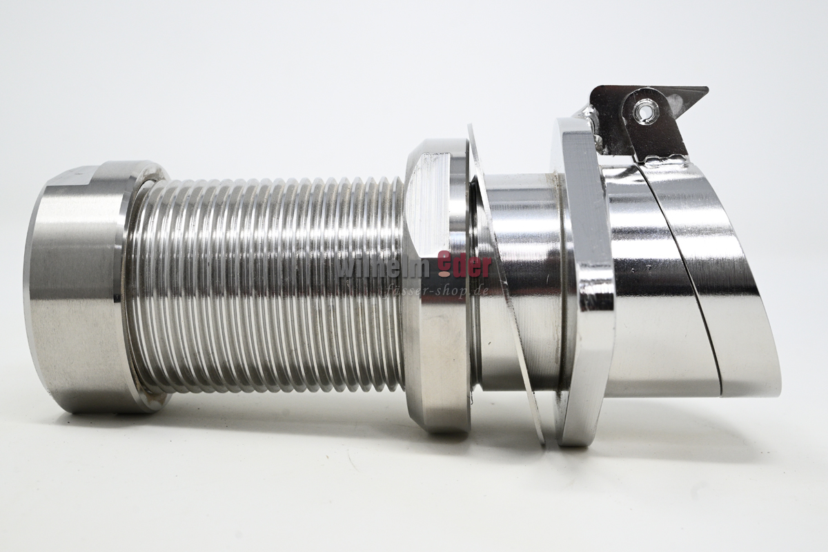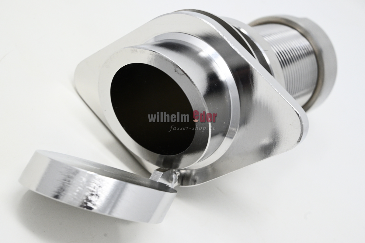 Die Zapflochklappe aus Edelstahl (V4A) wird fertig in die Holztür vom Fass eingebaut. Die Klappe liegt im Fass und ist dicht. Erst durch einführen eines Rohres kann man das Fass entleeren.