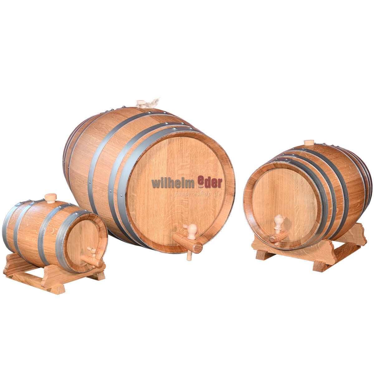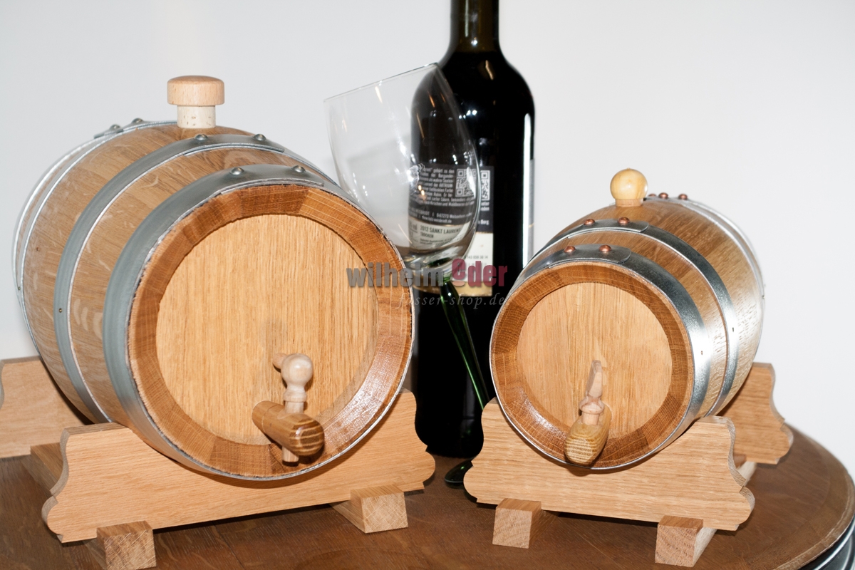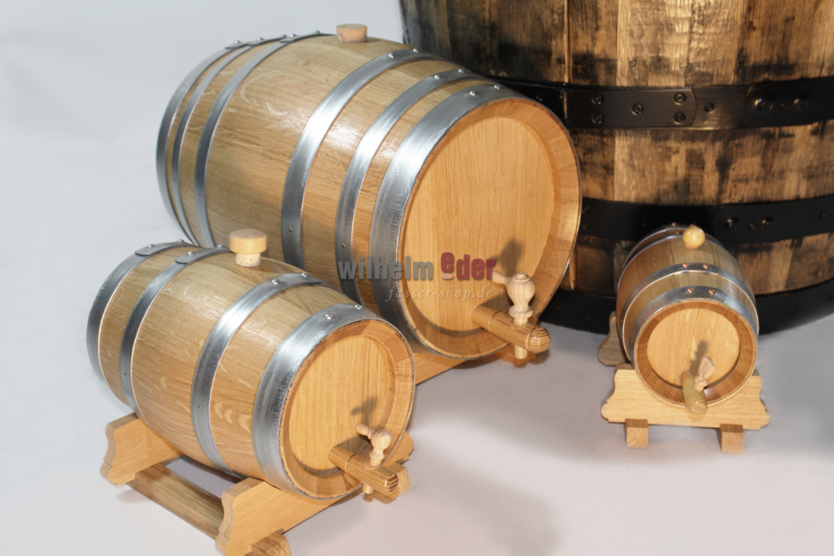 Alle Fässer sind mit verzinkten Reifen, einem Fassbock (bis einschließlich 20 l), Hähnchen und Spund ausgestattet.