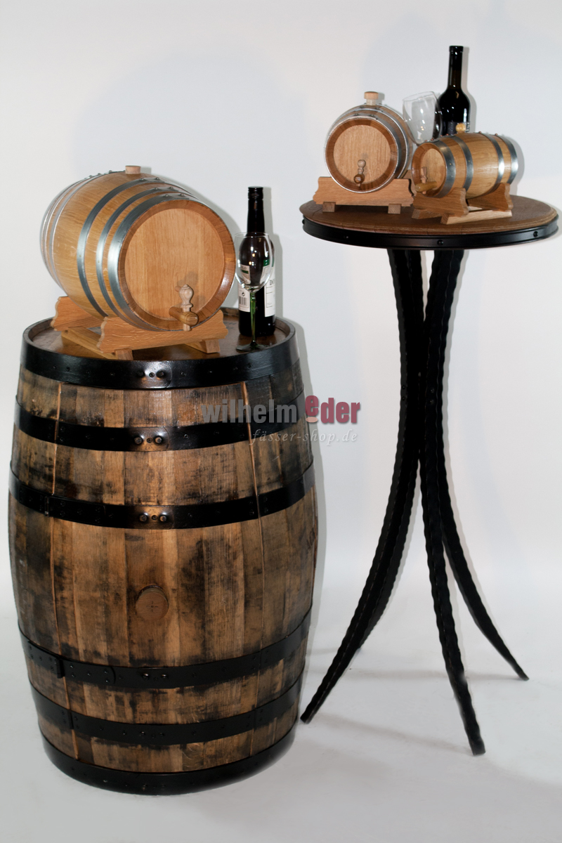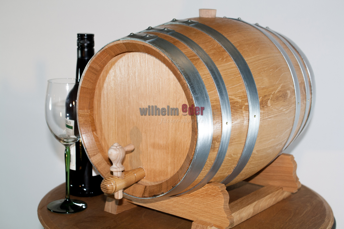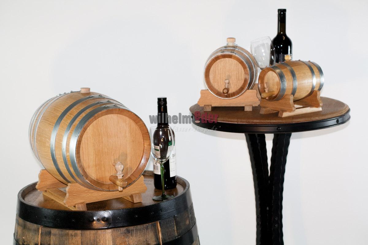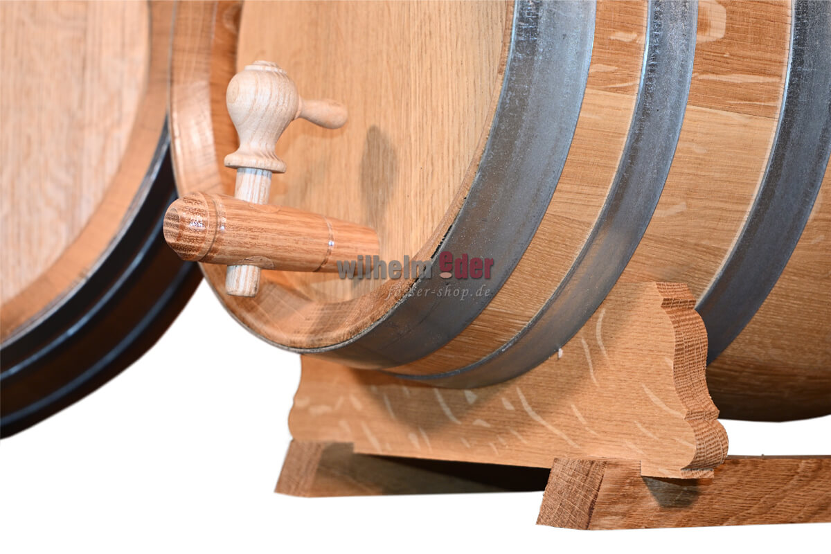 Alle Fässer sind mit verzinkten Reifen, einem Fassbock (bis einschließlich 20 l), Hähnchen und Spund ausgestattet.